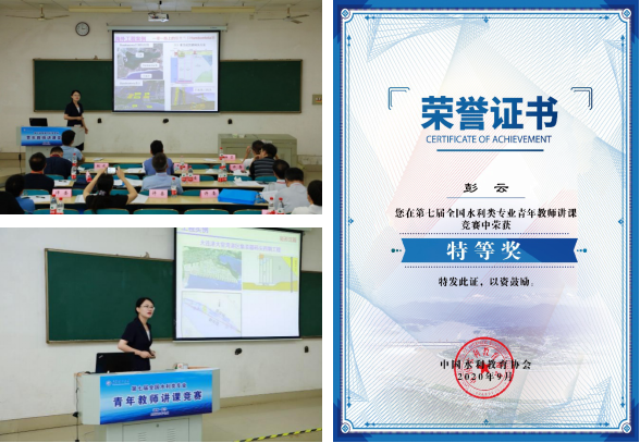 水利类专业青年教师讲课竞赛两年举行一次,在本次比赛中,我校推荐港航与海洋工程学院彭云副教授参赛。通过“抽签定课”,彭云副教授以“沉箱码头的结构型式及计算”为参赛内容,以实际工程典型案例为契机,采用层层递进的启发式教学方法,着重培养学生的创新思维和理论联系实践、解决复杂工程问题的能力,也培养了学生们的专业自豪感,激发了学生们的学习热情。同时,将思政教育有机融入课堂教学,引领学生思考在工程中如何做到“绿水青山就是金山银山”,充分展示了港海学院新时代青年教师的教学风采,表现突出,最终获得港航组特等奖。