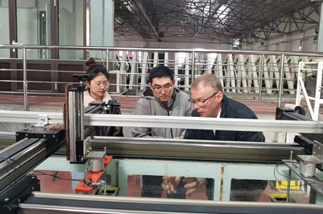 Tomasz Kolerski教授首先与王庆凯副教授一起参与了双层流的冰脊拖曳试验,并就试验目的、参数设计和试验方法与博士生王爽进行了探讨。Tomasz Kolerski教授针对实验室水槽物理模型试验与真实海域的差别提出了建议,同时也表示课题组PIV试验的独特设计为波兰格但斯克工业大学开展类似试验提供了新思路。