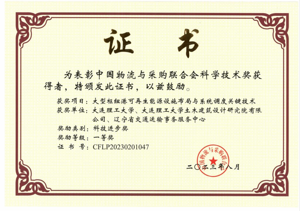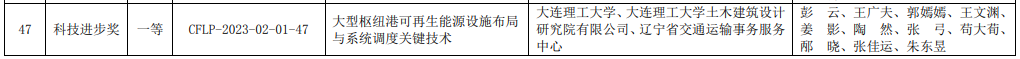 2023年8月,经形式审查、初评、复评和终审,大连理工大学港航与海洋工程学院彭云副教授牵头的大型枢纽港可再生能源设施布局与系统调度关键技术在786份申报材料中脱颖而出,荣获科学进步奖一等奖。